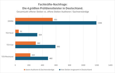 Schon heute ist der Anteil der offenen/unbesetzten Stellen für Auditoren und Sachverständige bei Prüfdienstleistern enorm hoch. Das zeigen die aktuell offenen Stellen der 4 größten Prüfdienstleister in Deutschland. (Quelle: Auswertung Karriereseiten, Stand: 02.07.24) Der „demografische Berg“ und das Fehlen von qualifiziertem Nachwuchs hat die Prüfdienstleister schon seit einigen Jahren erfasst.
