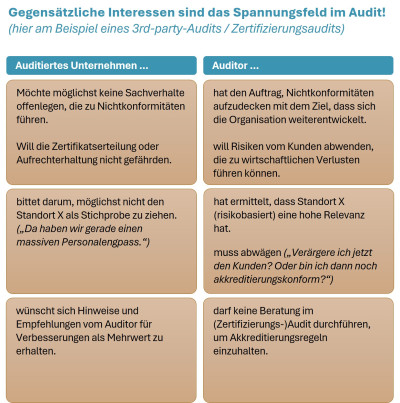 Führungskräfte sind in ihrem gewohnten Arbeitsalltag die Personen, die „führen“. Sie stellen Fragen, sie geben Bewertungen ab. Im Audit sind diese Rollen vertauscht. Der Auditor fragt, die Führungskraft antwortet. Dieser Mechanismus ist nicht zu ändern. Allerdings können Auditoren das Risiko eines Konfliktes minimieren.